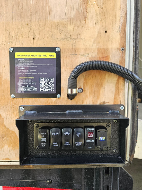 The ramp operates utilizing a winch connected to our in-house designed halo beam system. It is powered by a lithium battery, which is recharged via a solar panel mounted on the roof.